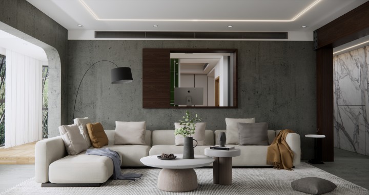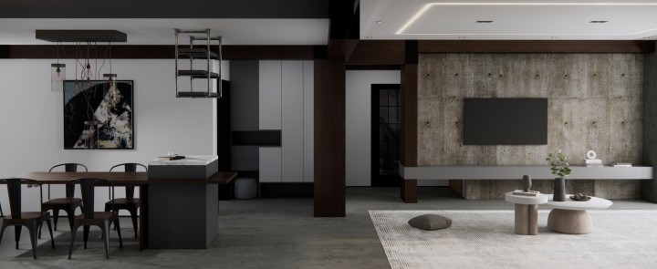 设计理念:设计源自于生活,但是不止局限于生活。本作将关于生活的冷静和体贴融入到了整个空间。空间的划分不局限于墙体,平行和错落将整个空间划分为多组独立区域,彼此之间相互沟通交流,明于暗中展现用途的差异。 此次设计并不是落地作品,而是设计师本人对于家的期待。业主是设计师本人和他的内人,相较于以往以温馨清新为主的设计色彩选择,这次设计更加的开放和大胆。相比于单一风格的选择,本次设计使用的元素很多,比如诧寂、现代、简约、工业、北欧、轻奢等等。设计师由于常常会在家办公所以将书房,卧室及客餐厅的空间进行了连通,让陪伴的概念存在于整个空间。同时对不同的空间做了不同类型的隐私保护,让分寸感抽离于开放的交流中。 客厅是主要的会客区域,也是家庭聚会的重要场所,沙发的温润在水泥质感的墙地面的衬托下,将与其冲突的绿植融入其中,带有铆钉的木梁和立柱将沉稳融入到淡雅的设计群中。地台的设计明显得区分了内外区域,将北欧的温暖和诧寂的淡雅融为一体。 电视背景墙遵循着一切从简的原则,使用和客厅墙地面同种质感轻微色差的水泥板,融入了工业色彩的狂野和直白。无主灯的设计与加长中央空调出风口将直率揉入到淡然的空间中,与白色的窗纱构建了宽阔而轻松的生活。 双鱼座的设计师是个矛盾的集合体,餐厅的图案是设计师的自白,在交叉的平面的空间中,做出交叉的反现实几何体。同样展现矛盾的是工业风格的餐桌与现代轻奢的大理石灯带墙面,工业的粗狂和现代的精致细腻被灯带分割为了现在与过去。 设计师涉猎广泛,在书房做了大量铁艺支架,来满足他对于书籍和各类展品的收纳,由于全屋中央空调加新风系统,设计师并没有使用玻璃门来防止积灰。使用集装箱推拉门作为书架的柜门,一门两用,分割了连通的主卧和公共区域。 业主是一对年轻情侣,他们对于家的理解各有不同,因此,设计师用灯带区分左右两边,将左边略带轻奢的北欧和右边简约现代进行了融合。而整体的空间既有阳光的温暖,又有时间的厚重。 次卧作为未来的儿童房,设计师做出了较为中性的设计,简单的线条,勾勒出家的温馨,靠床的书桌既是孩子未来学习的战场,也是陪伴夜晚的床头柜。
